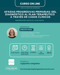 El Colegio Profesional de Logopedas de Canarias, a través de su área de formación, organiza el curso “Afasias progresivas primarias: del diagnóstico al plan terapéutico a través de casos clínicos”.